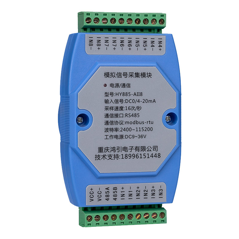 采用進口16位模數轉換芯片,把8路DC0-20mA模擬信號轉換成數字信號,通過RS485接口輸出,DC0-20mA輸入對應的數字量為0-20000,最高可測到DC24mA。DC0-20mA模擬信號輸入與工作電源、RS485之間隔離。RS485通信采用標準modbus-rtu協議,可與各種組態軟件,PLC,觸摸屏聯網。出廠預設RS485通信參數:模塊地址1,波特率9600,8個數據位,無校驗位,1位停止位,用戶通過上位機參數設置軟件修改通信參數。