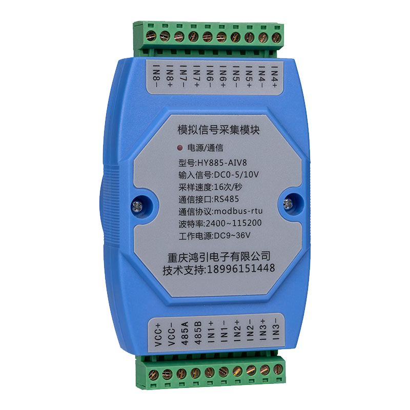 VCC+、VCC-:電源的正負輸入接口。485A、485B:RS485的A、B接口。INx+、INx-:第x路DC0-5V(10V)輸入接口,x代表1~8。