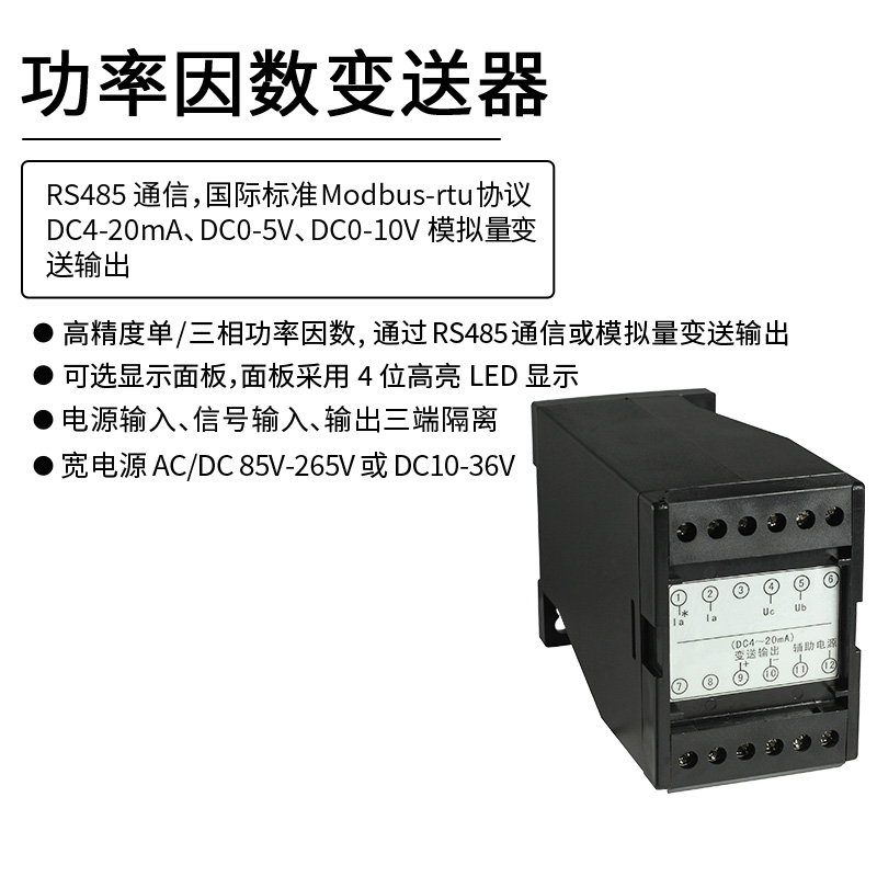 HY194-BS4H功率因數(shù)變送器,是一種把單相功率因數(shù)或三相功率因數(shù)測量值轉換成線性直流隔離標準模擬信號輸出或RS485數(shù)字通信接口輸出。模擬量可選:DC0~20mA、DC4~20mA、DC0~5V、DC0~10V等變送輸出。RS-485數(shù)字通訊接口,采用標準MODBUS-RTU通訊協(xié)議,可與各種PLC、HMI、組態(tài)軟件實現(xiàn)組網。