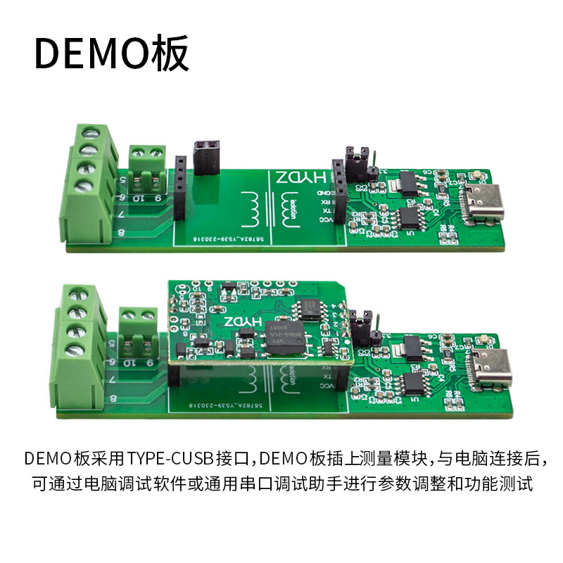 DEMO板采用TYPE-C USB接口,DEMO板插上測量模塊,與電腦連接后,可以直接在電腦上用我們的調(diào)試軟件或用通用的串口調(diào)試助手進(jìn)行模塊的參數(shù)調(diào)整和功能測試。